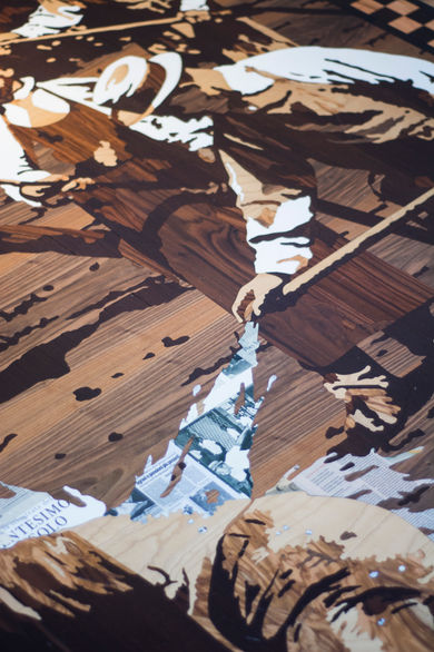 Inaugurant le parcours d’exposition, l’œuvre Le monde est une invention sans futur nous invite à parcourir une installation au sol de 110m2 réalisée en marqueterie. Les représentations qui la composent sont inspirées de sept scènes issues des films des Frères Lumière, revisitées sous l’angle de notre histoire contemporaine. L’émerveillement et la légèreté présents dans le jeu des acteurs des premiers films de l’histoire du cinéma laissent ainsi place à une vision plus sombre de notre société, entre villes modernes en ruines, déplacements de populations, révoltes populaires et états d’insurrections.